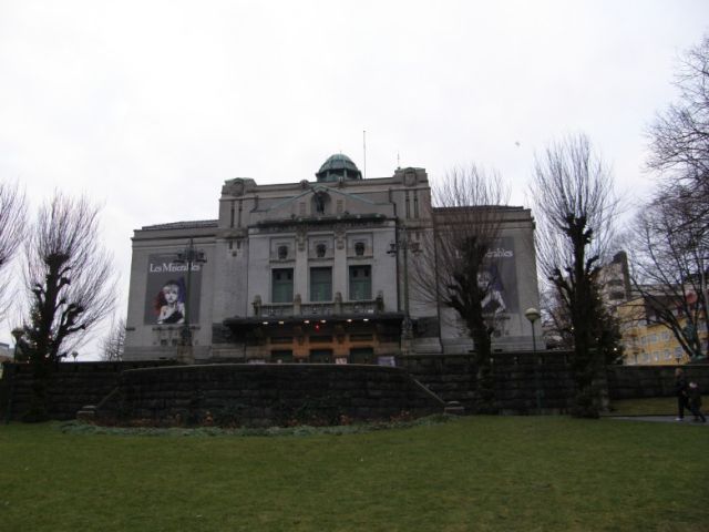 昔は路面電車が走っていたらしく、線路の跡が。右下は劇場です。