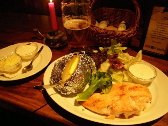 ビールはさすがに高い。そして料理も高い。ノルウェーサーモンを注文。サーモンとポテト用にサワークリーム(ヨーグルト)が付いてきました。ボリュームはあったけど、全体的にそれほど美味しいという味ではなかったです。たぶん、サンドイッチとかファーストフードを食べた方が無難だったと思います。