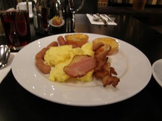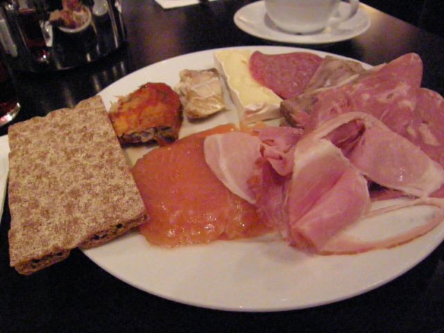 レストランはすごくおしゃれな感じ。部屋数の割には小さい感じもしたけど。。。まずはソーセージなど、普通の料理を。卵がすごく美味しかったぁ。第2ラウンドに向かうと、なんとサーモンなど魚類の他、ハムやチーズも種類豊富に。ここぞとばかりにドッサリ、サーモンを食べました。