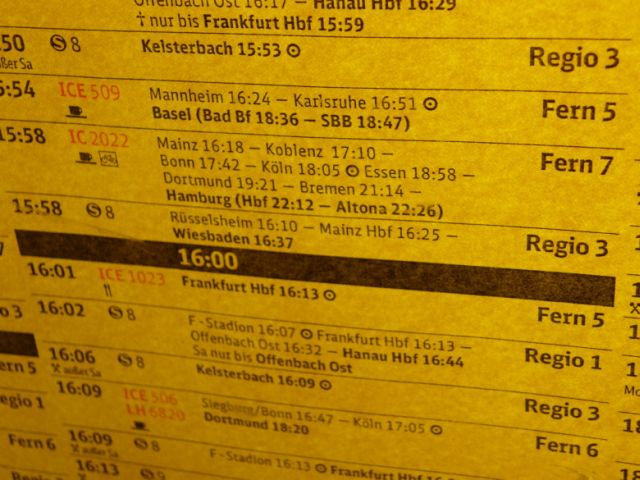 一昨日、フランクフルトに到着した時には、Sバーン(近郊鉄道)の乗り方、切符の買い方もさっぱりわからなかったけど、時刻表を見つけて何となく、段取りがわかってきた。行先に関係なく時刻順に載っている時刻表から、行先に合わせた列車を見つけ、発車時刻、到着時刻、乗り場をチェックすれば何とかなる。