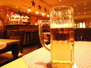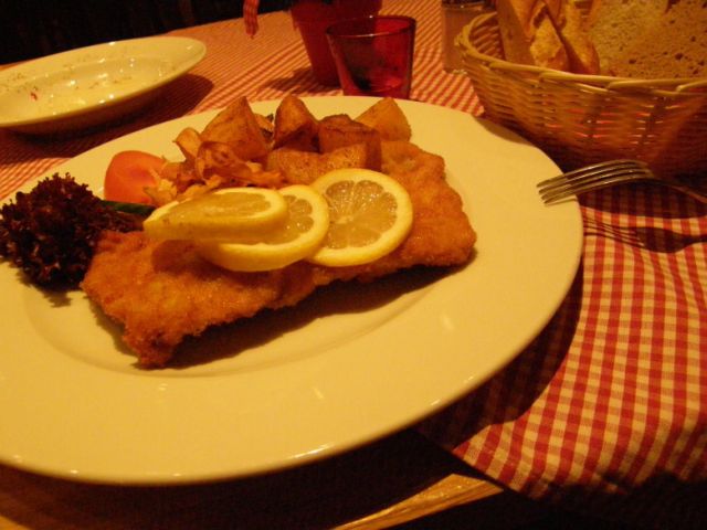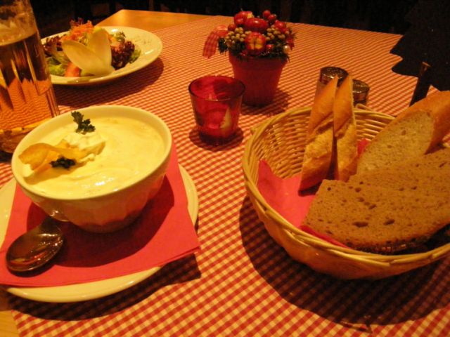 しばらくすると、ちゃんと英語のメニューとドイツ語のメニュー2冊が出てきた。でも、英語のメニューを見てもわからず、結局ガイドブックも取り出し、見比べ。しばらくすると、若い男性店員さんが来て、対応してくれた。ガイドブックの肉料理というドイツ語を指さすと、写真が載っていた料理があるとのことで、即注文。加えてスープも頼みました。