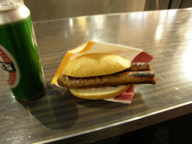 日本までの便へ乗り継ぎの良い便もあったのですが、余裕を持たせたので、出発4時間前にフランクフルト空港に到着。2時間くらいは自由時間がありそうなので、電車賃を払ってでもソーセージを食べたいと思い、電車に乗ってフランクフルト中央駅へ。初日に食べたお店に戻り、同じパンを食べました。やっぱり美味しい!空港で高いのを食べるよりも満足感があります。